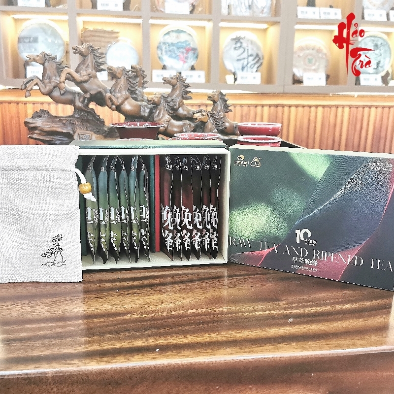 Hộp 2 gói Đỏ và Xanh là bộ trà phổ nhĩ Sống và Chín, gồm 6 miếng PN sống và 6 miếng PN chín, mỗi miếng 36g và 40g ép dạng socolo có thể tách từng miếng nhỏ 6-7g
